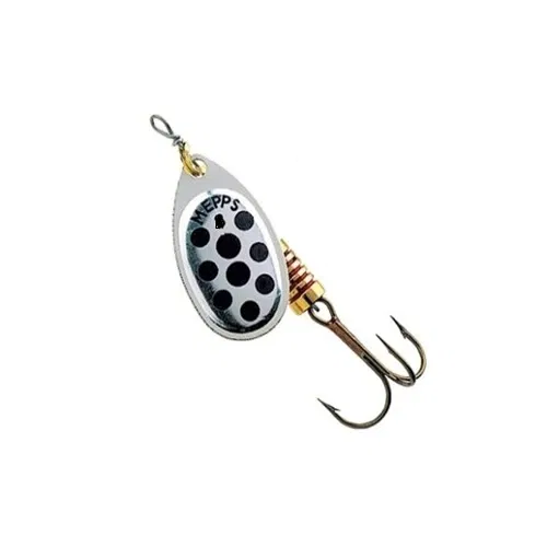 Cucchiaino rotante MEPPS aglia con paletta argentata oltre a sfruttare i bagliori classici imposti dal movimento, va ad imitare un insetto caduto in acqua. È estremamente popolare in tutto il mondo per il colore attrattivo determinato dai costanti e repentini bagliori di luceemessi dalla rotazione della paletta appena entra in acqua.