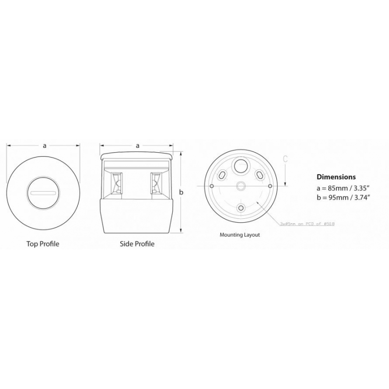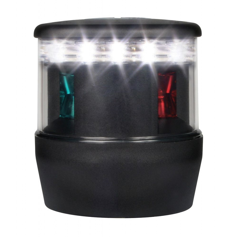 Fanale di via per testa d'albero a led con luce di sinistra, dritta e poppa combinati, più luce di fonda da accendere con un altro interruttore. In nylon resistente ai raggi UV e gli urti, attacco per fissaggio su asta in acciaio inox. Lenti in Grilamide e cassa stagna IP67 in materiale antishock resistente a corrosione e raggi UV. Consumo ultra basso, con 40 cm di cavo marino precablato, dotato di circuito di protezione per picchi di tensione e inversione di polarità. Multivolt 9/33V. Certificati BSH, IMO Col Reg 72, USCG, ABYC A-16, Maritime NZ.