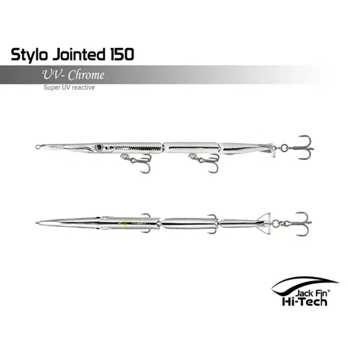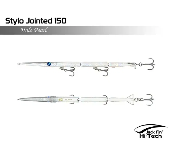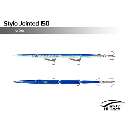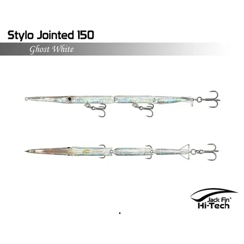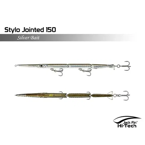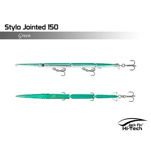 Artificiale Jack Fin Stylo 150 Jointed è un'apprezzata esca snodata da spinning per imitare in modo realistico in modo realistico il movimento dell'aguglia, ideale per la pesca della spigola e pesci serra. L'esca è snodata in tre sezioni e dotata di un innovativo "paddle tail" (coda a paletta) che genera un movimento sinuoso ed estremamente naturale, rendendola realistica "come una vera aguglia". È efficace sia con recuperi veloci (per pesci attivi) che lenti (per pesci apatici).