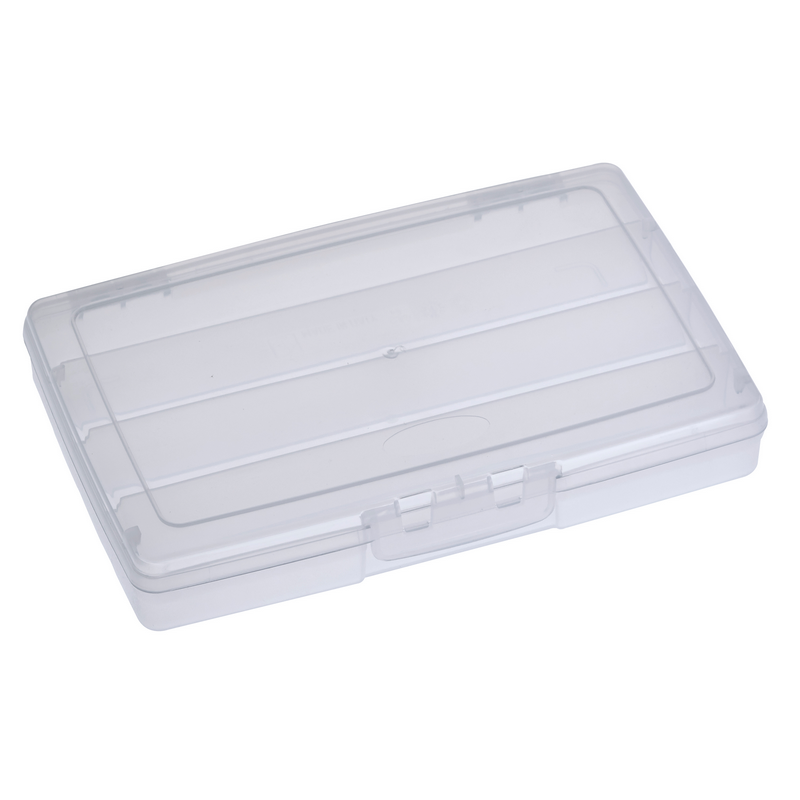 Scatola Porta Minuterie 191/VN in plastica da pesca con misure interne 245 x 165 x 40 mm / 9.64 x 6.48 x 1.57 inch. Colore trasparente. Questa scatola porta minuterie è disponibile in diverse configurazioni: vuota, con 4, 6, 7 o 12 scomparti interni. Materiale: polipropilene.
